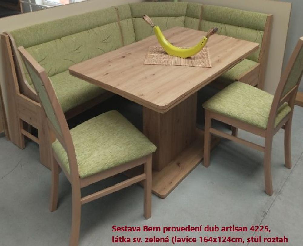 lavice 124x164cm, stůl roztahovací 110x70cm, 2xžidle Laura