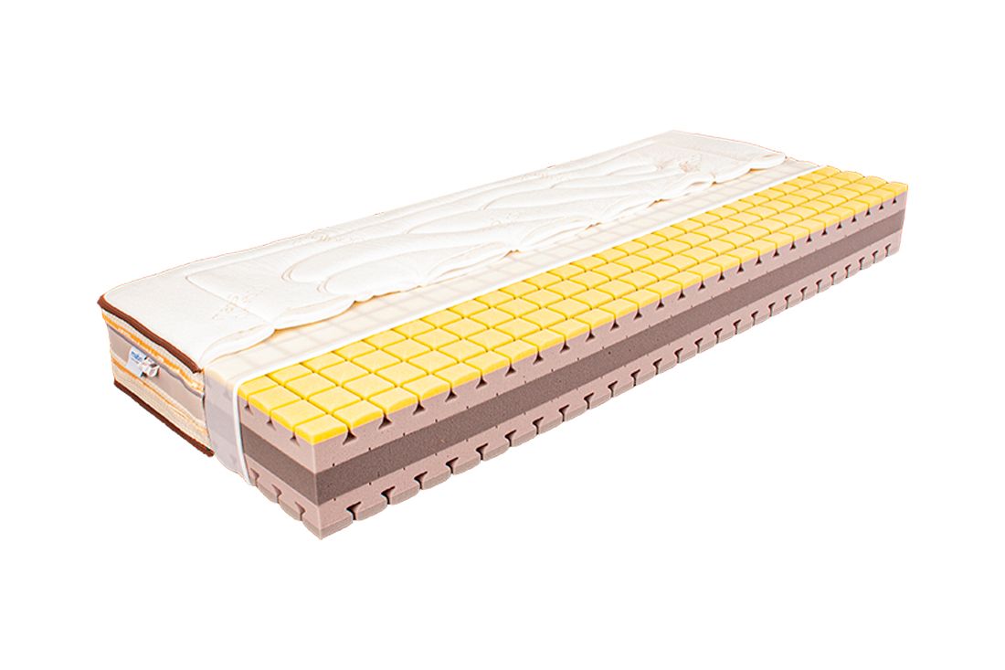 Jádro této luxusní matrace tvoří viskoelastická líná pěna SILVER, HR studená pěna s vysokou gramáží 55 kg/m3 a tvrzená PUR pěna 40 kg/m3. Matrace s tuhým jádrem a příjemně měkkým povrchem. Profilace lehacích vrstev matrace podporuje proudění vzduchu a tím prodlužuje životnost matrace a udržuje jádro matrace hygienicky čisté. Špičkové materiály jsou zárukou dlouhé životnosti a vysokého komfortu u této matrace. Pěna s takto vysokou hustotou /55 kg/ nemění své vlastnosti po celou dobu životnosti matrace. Nevznikají tak odchylky v tuhosti matrace v různých zátěžových oblastech. Proto je hustota pěny při výběru matrace nejdůležitější parametr. Jádro matrace obsahuje rostlinný extrakt, který snižuje spotřebu nerostných surovin a má příjemný vliv na pokožku uživatele. Dělitelný na 2 poloviny a pratelný potah matrace (60st.C). Matrace je vhodná na lamelový rošt s polohováním nebo na pevnou podložku. Možnost polohování.